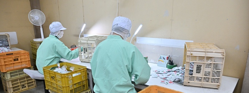 鈴勝塩業では、機械による自動化の難しい出荷前製品の最終検品、袋詰め、梱包作業などを行っています。